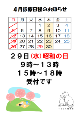 29日(水) 昭和の日 9時~13時/15時~18時の受付です。